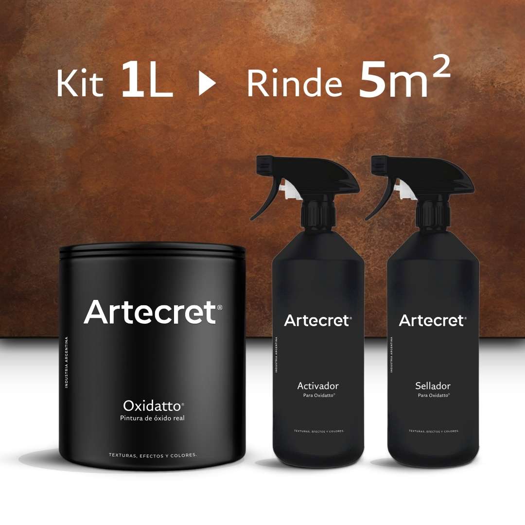 El kit efecto oxidatto® de hierro incluye: Pintura Oxidatto® de hierro, Activador de óxido y Sellador fijador de óxido, y está disponible en presentaciones de 1 litro, 4 litros, 10 litros y a pedido, en balde de 20 litros. El rendimiento del kit es de: